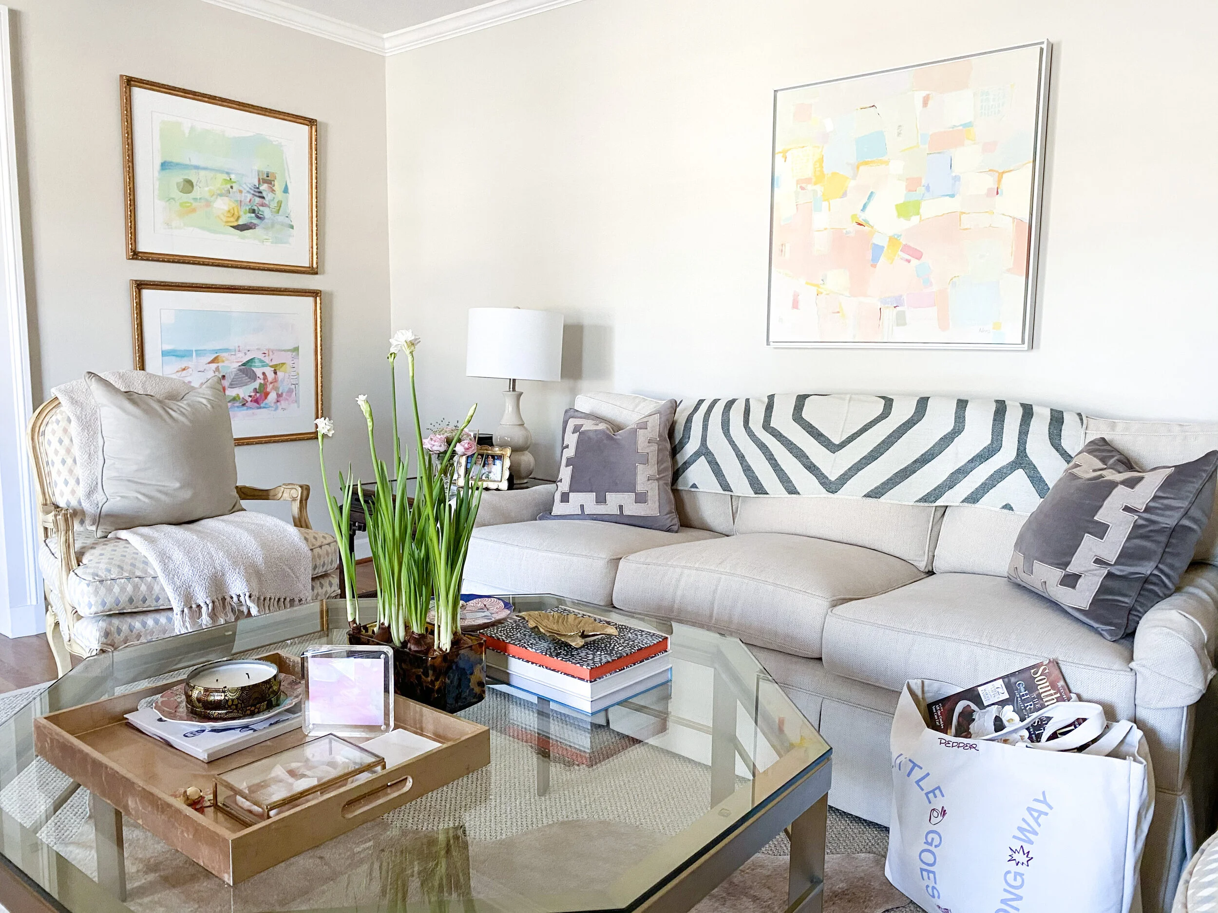 Other Sources: Art, Beach Print Top, Beach Print Bottom, Greek Key Pillows, Sisal Rug, Hide Rug, Gourd Lamp, Wall color 50% Accessible Beige