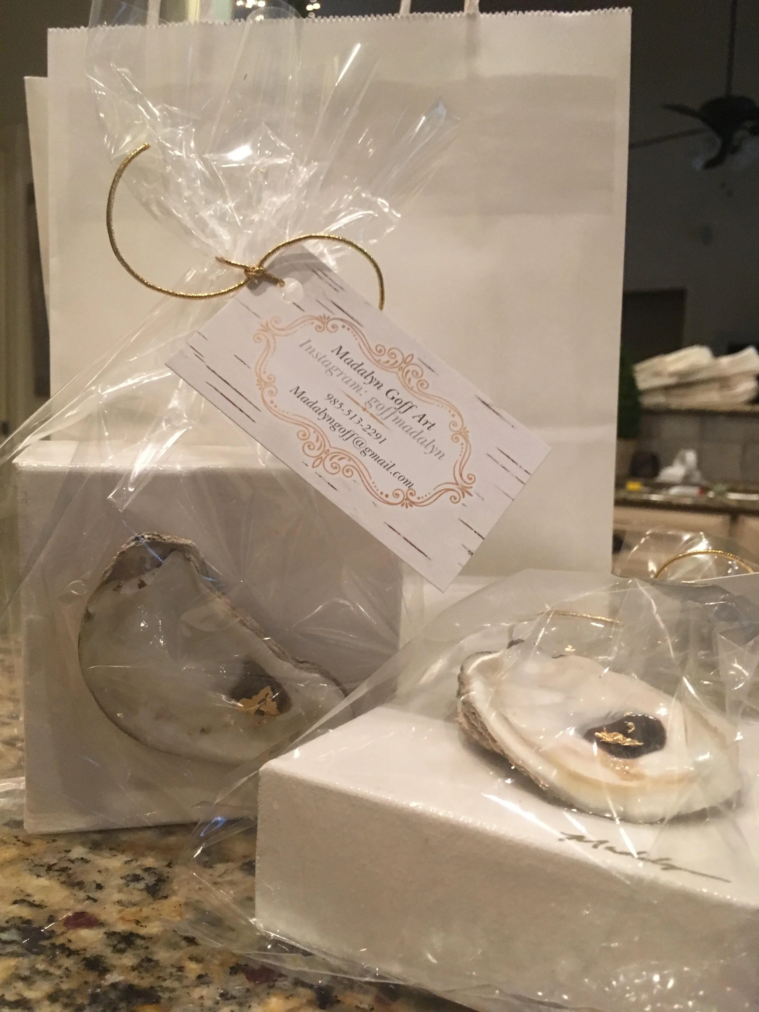Oyster ornaments (shown below) that can be personalized with business names or family names, year, wedding date etc. $10 each. Via instagram.